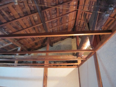 天井板を全て取っ払って、新たに断熱・防湿剤を入れて施工していきます。